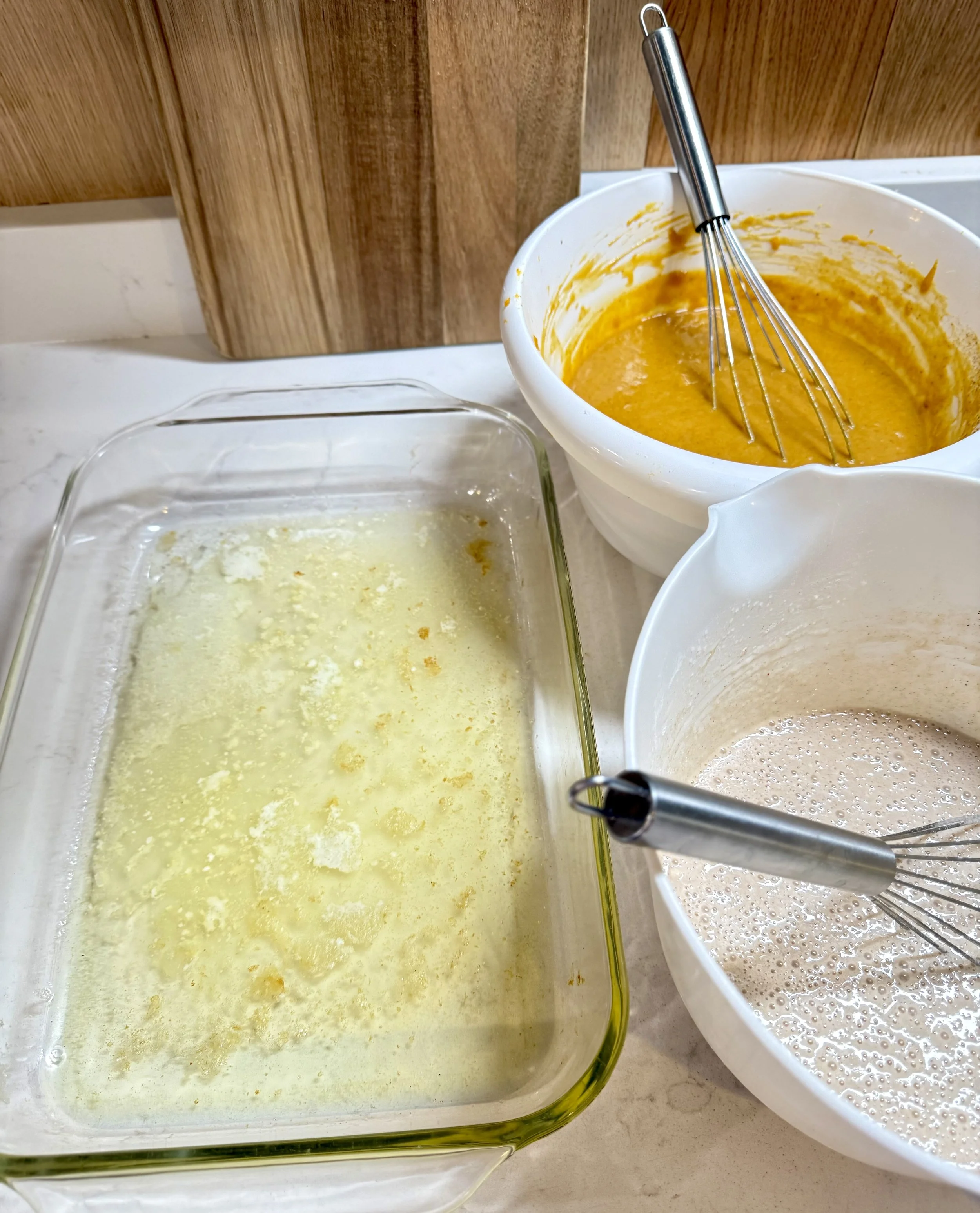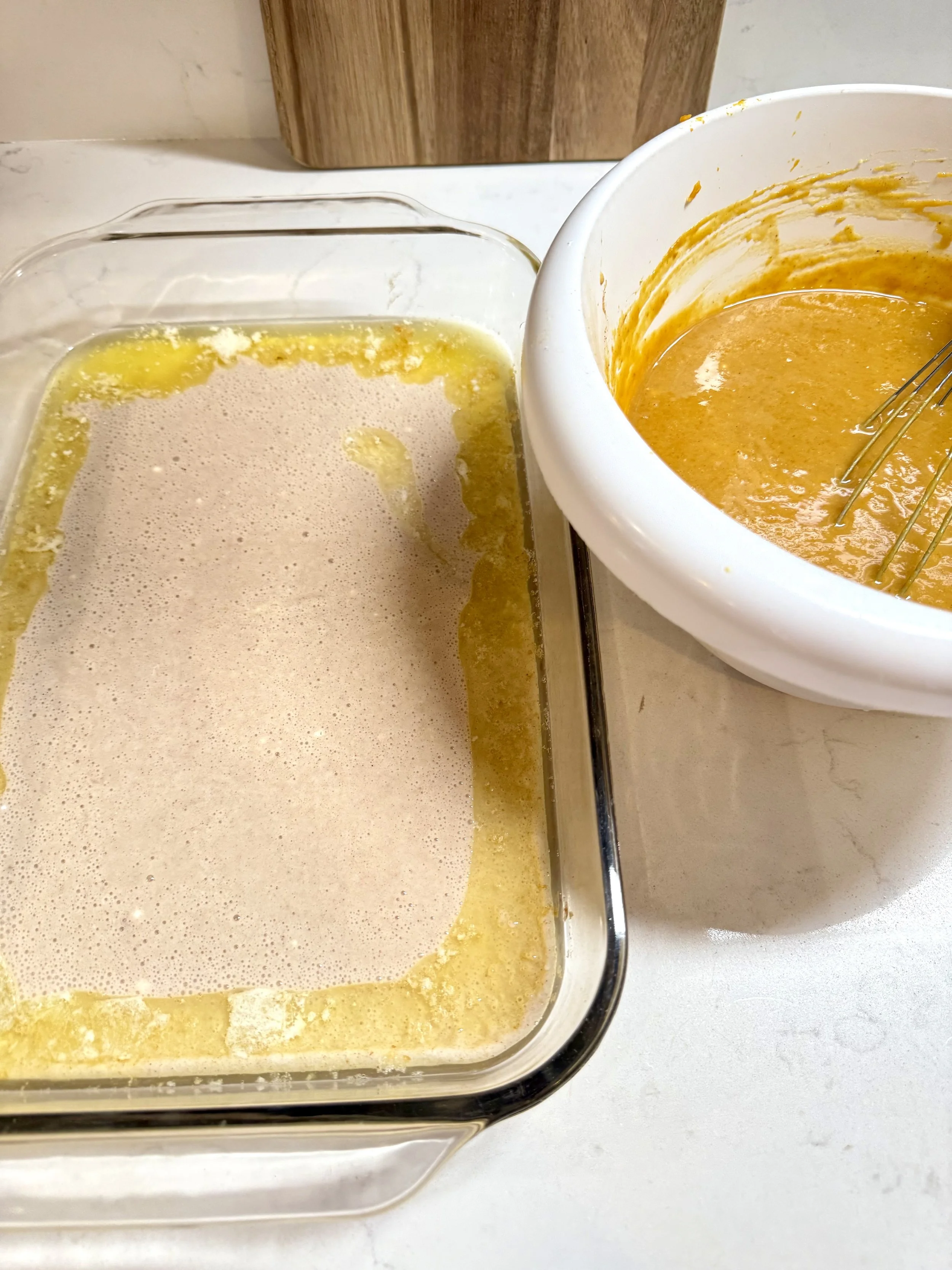 - Place ½ cup butter in the pan and melt it in the oven (about 5–6 minutes).