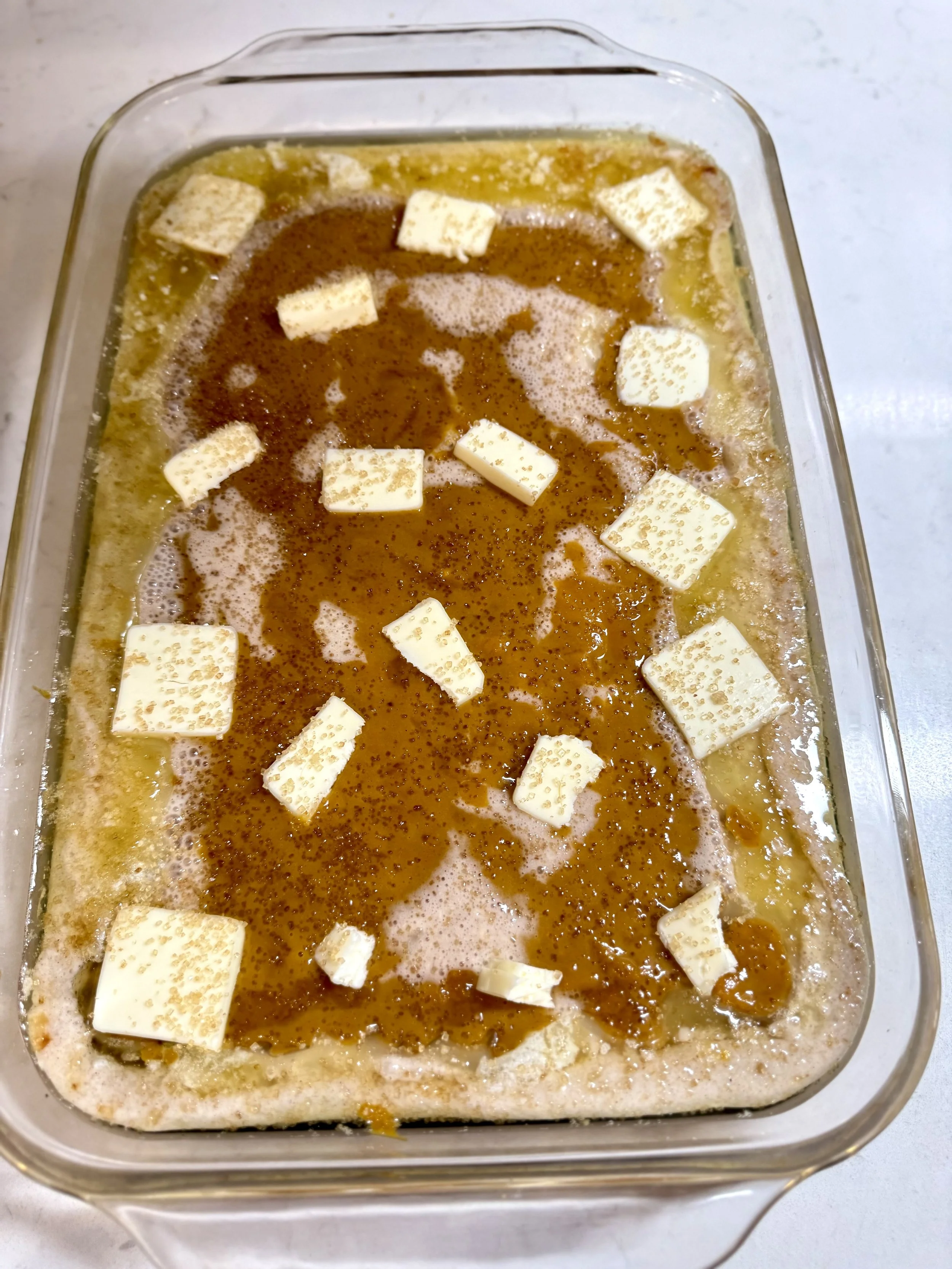 Pour the batter on top of the melted butter and DO NOT STIR!