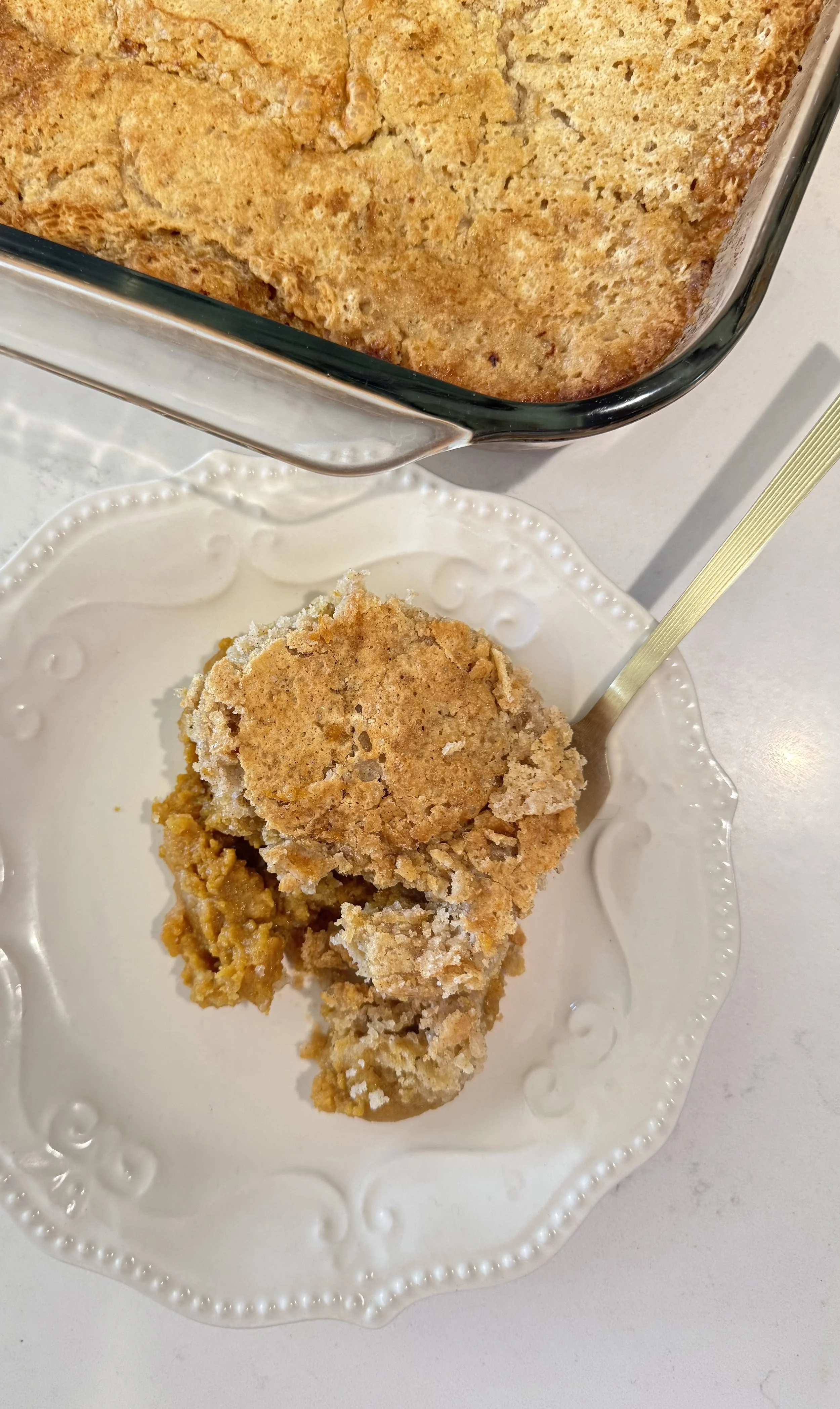 Pour the pumpkin filling on top of batter and DO NOT STIR!!! The layers will magically flip flop, leaving you with a beautiful cobbler crust on top.
