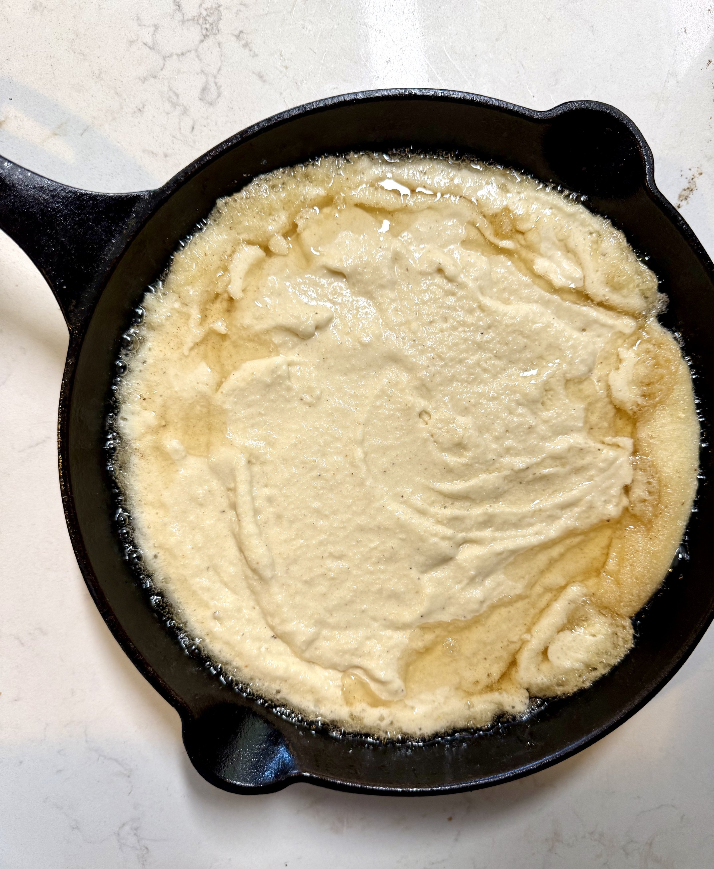 - Pour the batter into the hot skillet (you’ll hear a little sizzle — that’s the magic).