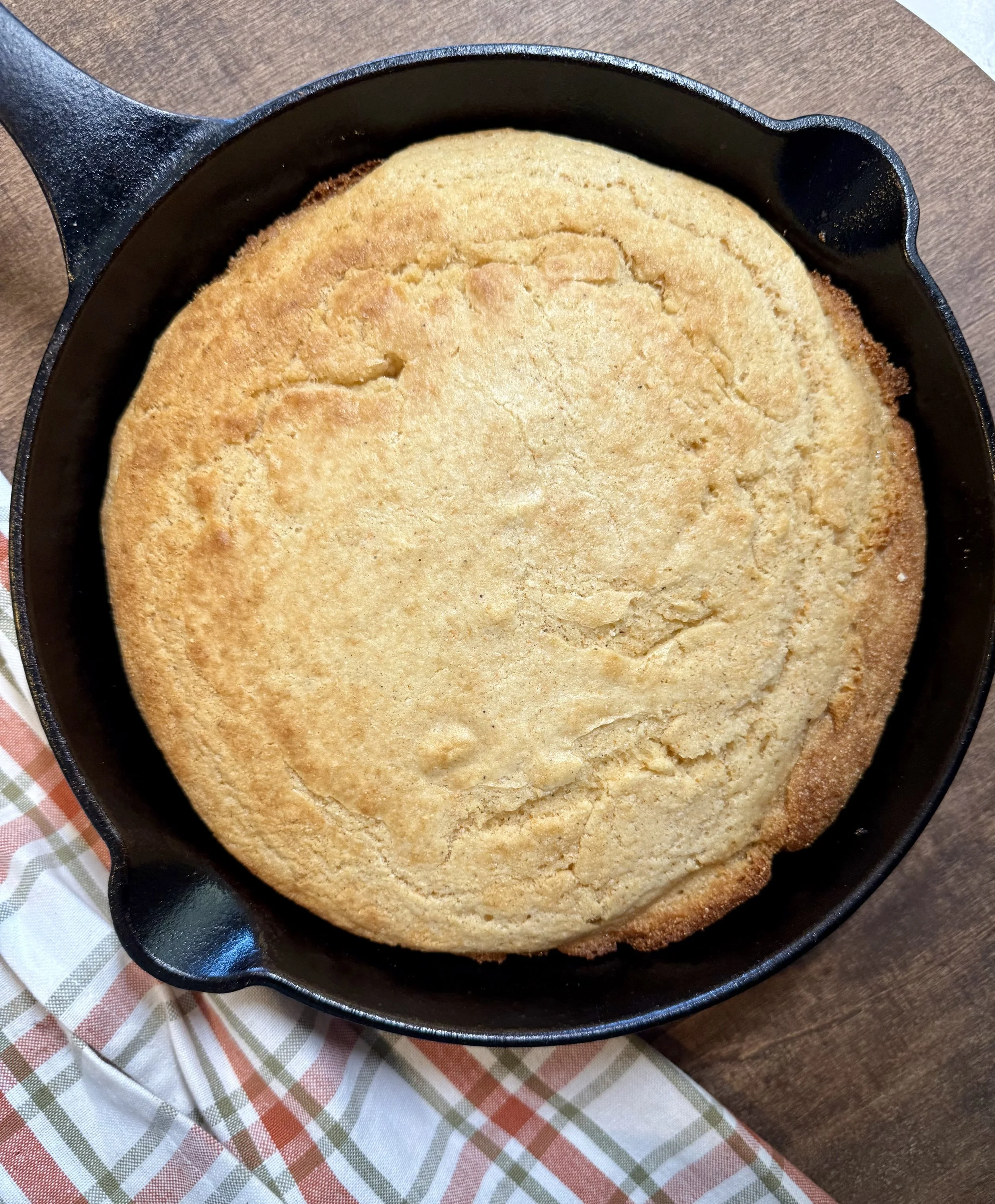 A classic, golden Southern cornbread baked in a seasoned cast iron pan— crispy on the edges, tender in the middle, and perfect with butter or a bowl of soup.