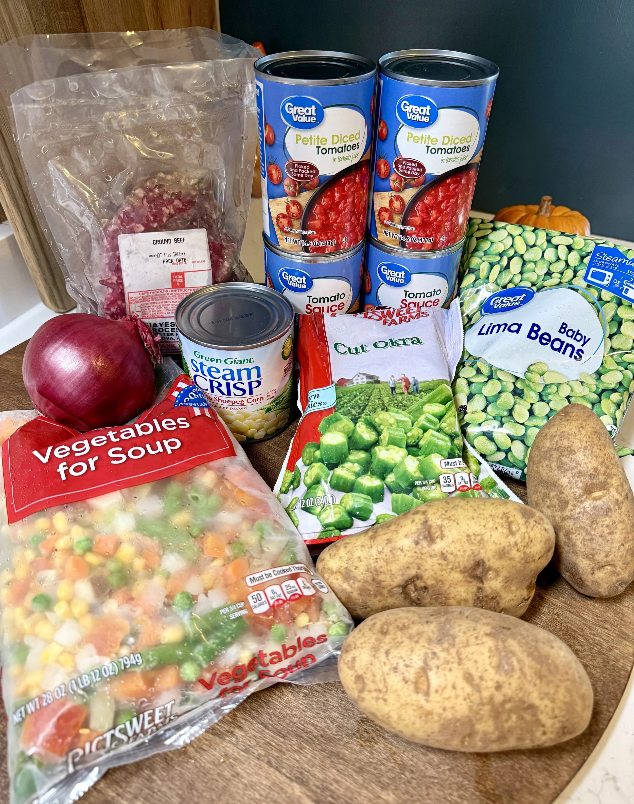 - Add the cooked beef mixture to a large slow cooker (6–7 quarts). Pour in the beef broth, tomato sauce, diced tomatoes, potatoes, frozen vegetables, shoepeg corn, okra, green beans, and Worcestershire sauce. Stir to combine.